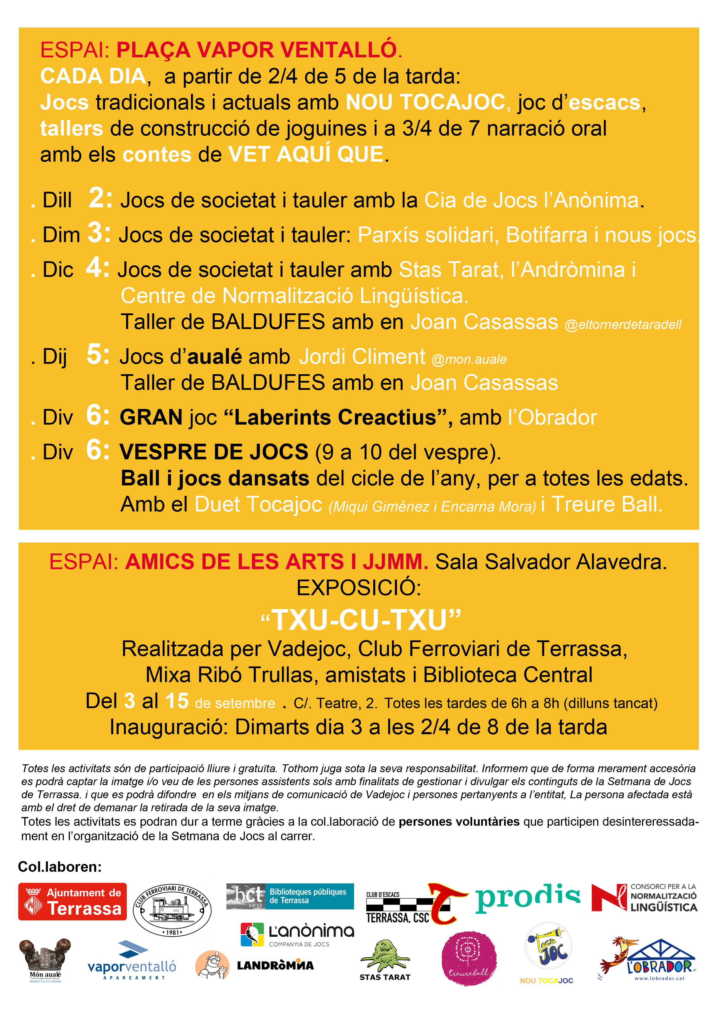 Presentem la 8a setmana de jocs al carrer que, com sempre, serà a la Plaça Vapor Ventalló de Terrassa, amb la programació habitual de jocs tradicionals i actuals, contes, tallers de joguines... que omplirà aquest espai durant aquests dies en un horari de 16:30 a 19 h.