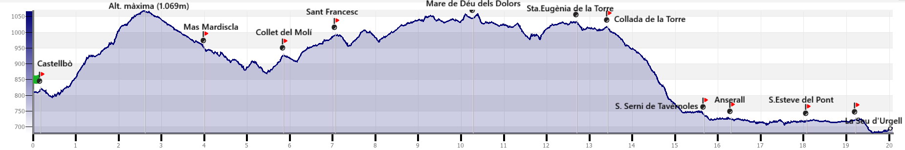 Castellbò, boscos del Comú de Castellbò, Planells de Mardiscla, mas de Mardiscla, Prat de cal Roqueta, collet del Molí, capella de Sant Francesc del Mas d'en Roca, serrat de la Mola, riu Bellestar, ermita de la Mare de Déu dels Dolors de Cal Porredon, torrent de la Guàrdia, serra dels Garrofers, Torre i mas de Santa Eugènia, collada de la Torre, mas de Sant Esteve, monestir de Sant Serni de Tavèrnoles, Anserall, borda i ermita de Sant Esteve del Pont, Castellciutat i la Seu d'Urgell.
