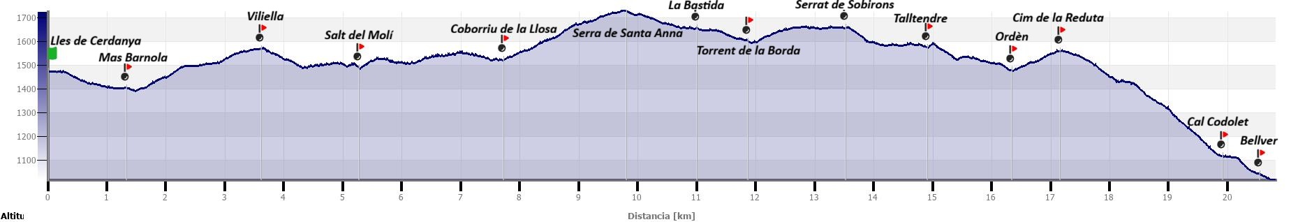 Lles de Cerdanya, mas Barnola, carretera de Viliella, Viliella, vall de la Llosa, riu de la Llosa, salt del Molí, Sant Antoni de Coborriu, Coborriu de la Llosa, camí de Santa Anna, camps de la Bastida, mas la Bastida, torrent de la Borda, Serrat de Sobirons, clot de Matamoros, Talltendre, torrent de Prat de Codines, Ordèn, Coll de Tans, cim de la Reduta, cal Codolet i Bellver de Cerdanya.