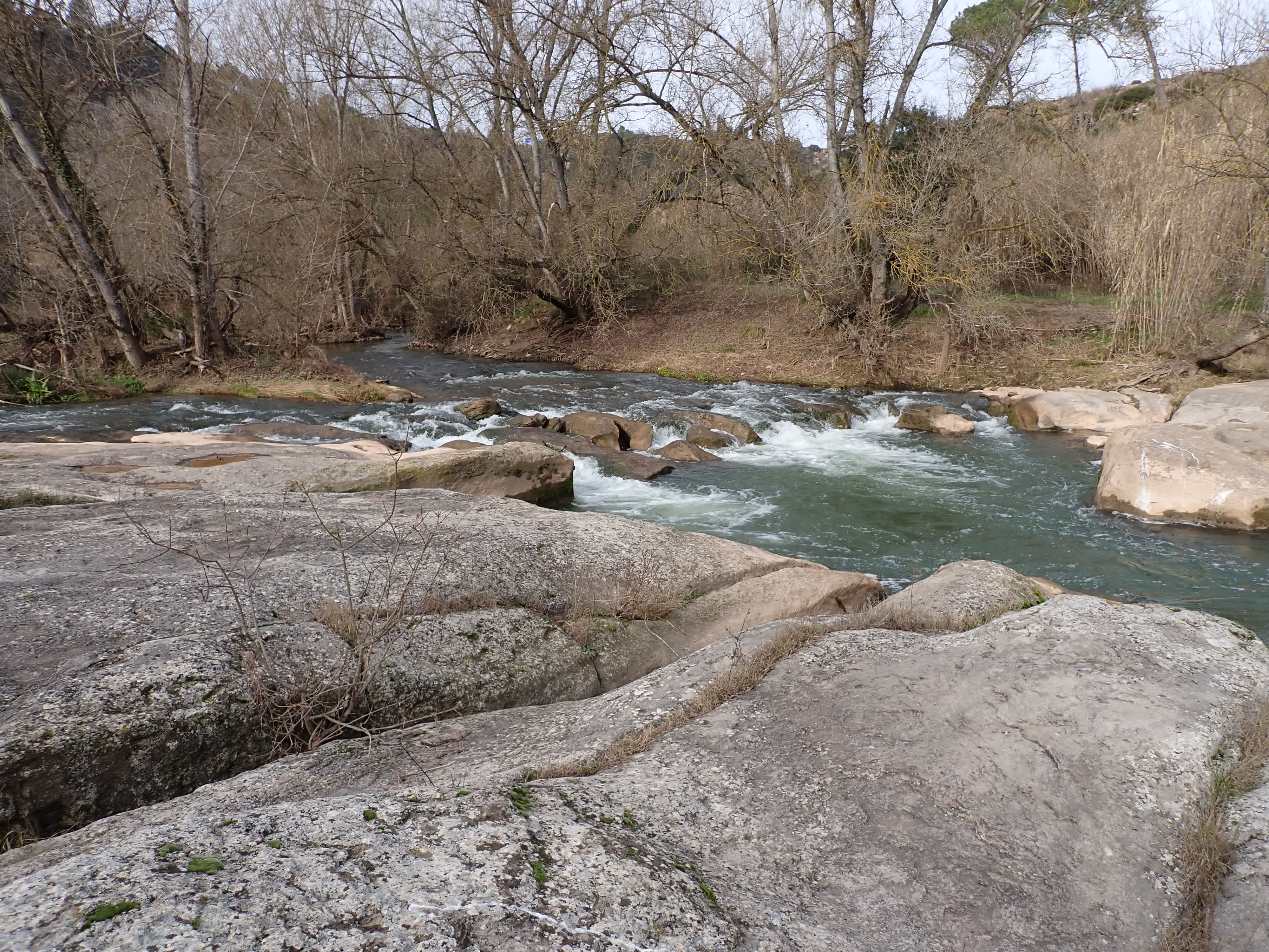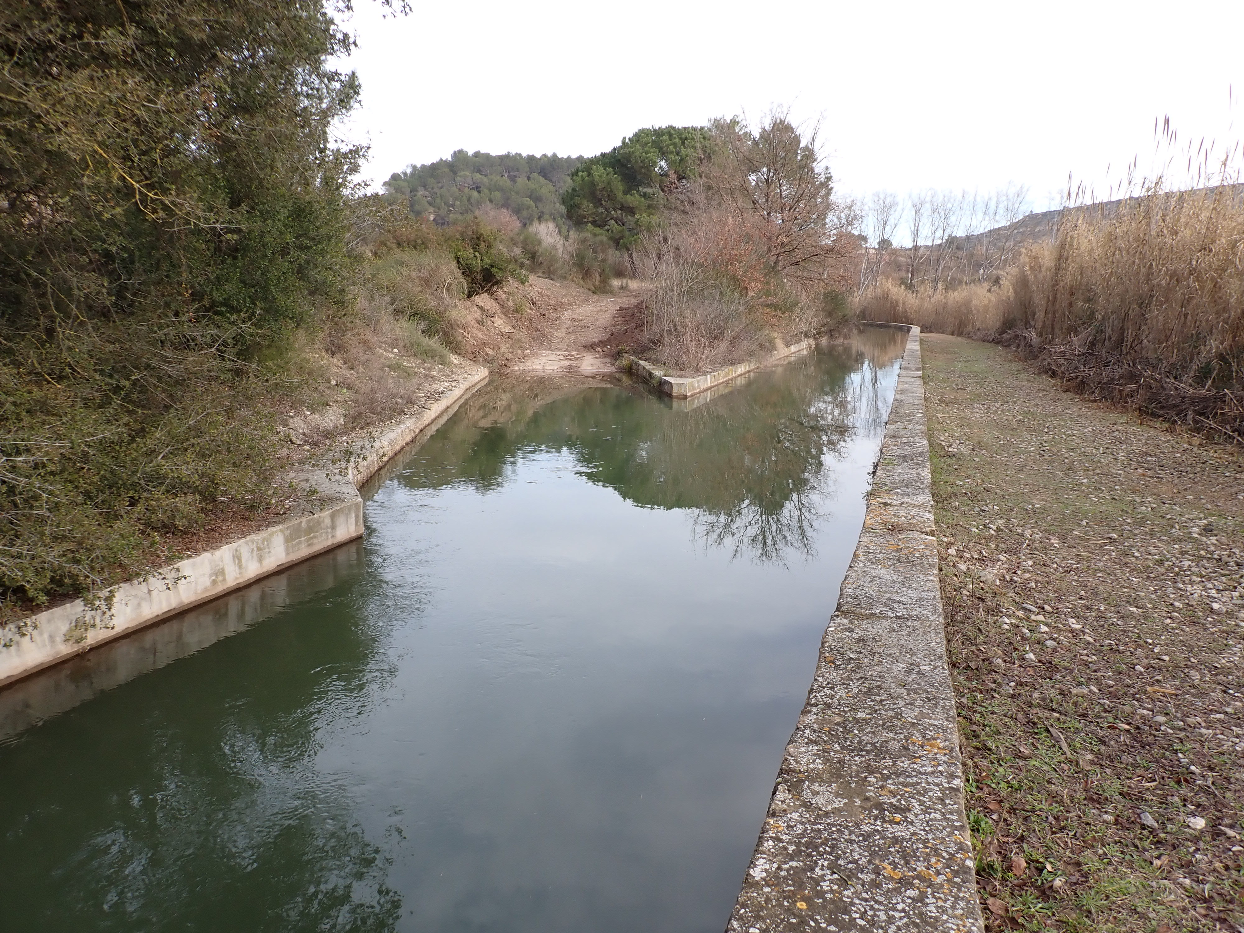 Travessem altre cop l’autopista, passem pel costat de l’actual cementiri de Viladordis i ara baixem per un corriol entre mig de camps cap el Llobregat. Observem que la major part del recorregut que fem avui està pintat amb marques verdes. Al costat d’uns camps hi ha una barraca de pedra feta aprofitant un sortint de la roca, una balma obrada. Veiem el canal de la Mina que ve d’un parell de meandres del riu més amunt, de la resclosa de la Mina, que ja vam veure en una alta trescada. Travessem el canal per un pont, el seguim un trosset i baixem cap a l’esquerra cap a la Casa de les Hortes.