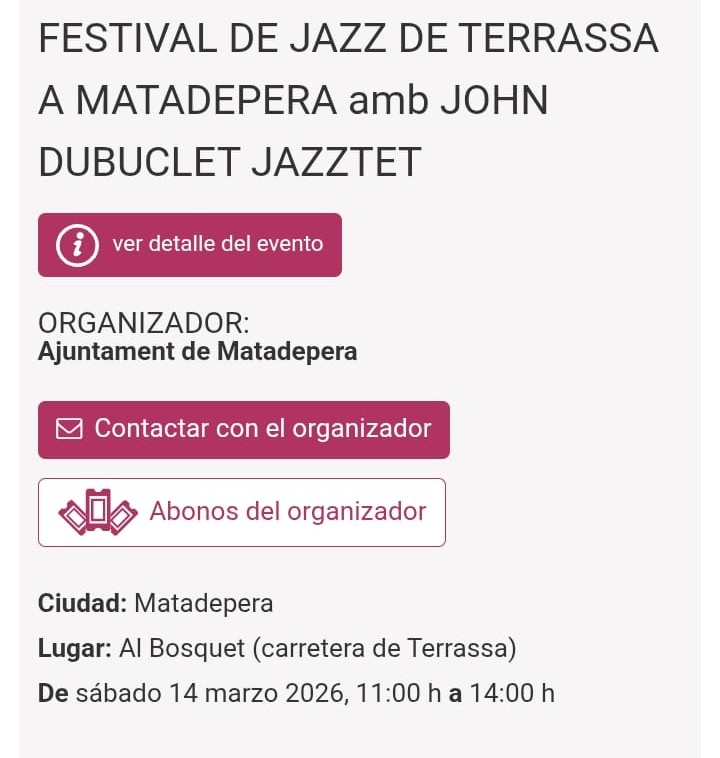 Concert posterior: Festival de Jazz de Terrassa a Matadepera amb John Dubuclet Jazztet – Al Bosquet (carretera de Terrassa), de 11:00 a 14:00 h.