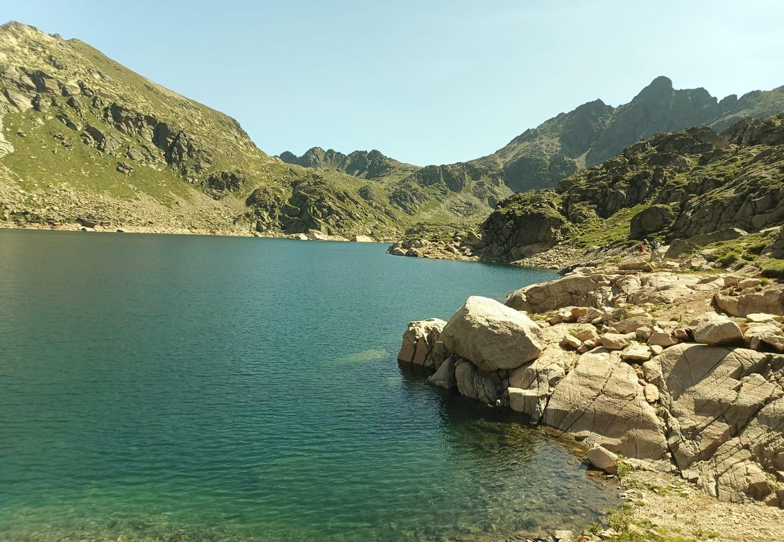 Sortim del refugi i travessem el primer estany per un petit pas equipat que ens condueix fins al segon llac. El camí cap al coll d’Alba està perfectament senyalitzat i va serpentejant entre petits estanys fins a situar-nos a 2.539 m, just a la frontera amb França.