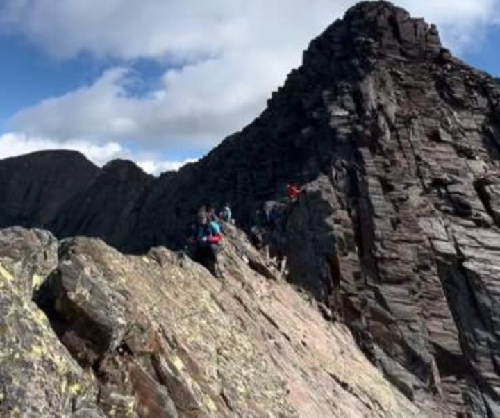 És vertical, però fàcil, per tant començarem a pujar, com sempre portarem cordinos per seguretat, anirem pujant flanquejant, i acabant per una petit xemeneia fins a dalt del petita paret... On trobarem la fita de la Punta del Sabre, de 3.134 m, espectacular i contentes continuem per la cresta més horitzontal ara, amb passos més aeris, altres estrets, altres més aresta… Sempre veient el nostre objectiu amb el pic del Gran Bachimala que ens espera.