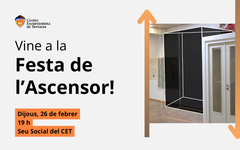 T'esperem a la Festa de l'Ascensor del CET! El dijous, 26 de febrer, el centre engega una campanya de captació de fons per fer realitat l'ascensor de la nova seu social. L'obra ja està feta i només ens falta comprar l'aparell, però necessitem ajuda! Comptem amb una subvenció de l'Ajuntament de Terrassa i recursos propis, però necessitem 13.000 € per assumir la despesa completa.