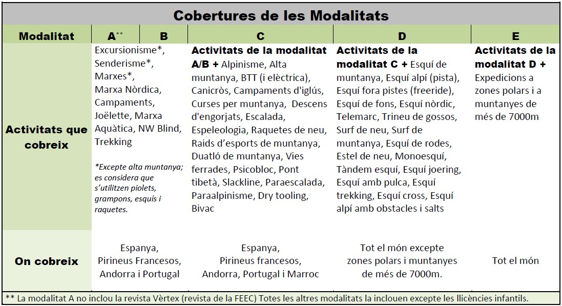 - La FEEC ofereix un ventall ampli de llicències i permet que cada usuari contracti la que s’ajusti més a les seves necessitats. Cada tipus de llicència té unes cobertures diferents en funció de les activitats que es practiquen, de l’àmbit geogràfic on es duen a terme les activitats i altres característiques.